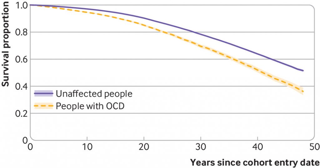 “Kaplan-Meier survival curves (with 95% confidence intervals) in people with obsessive-compulsive disorder (OCD) and matched unaffected people” (de la Cruz, et. al)